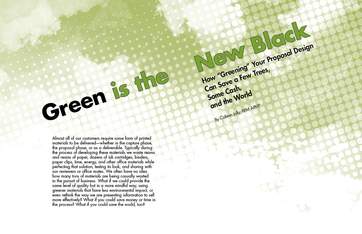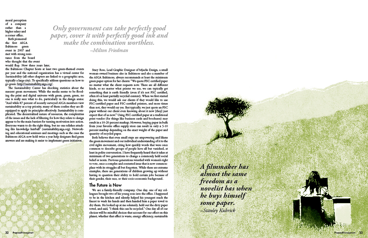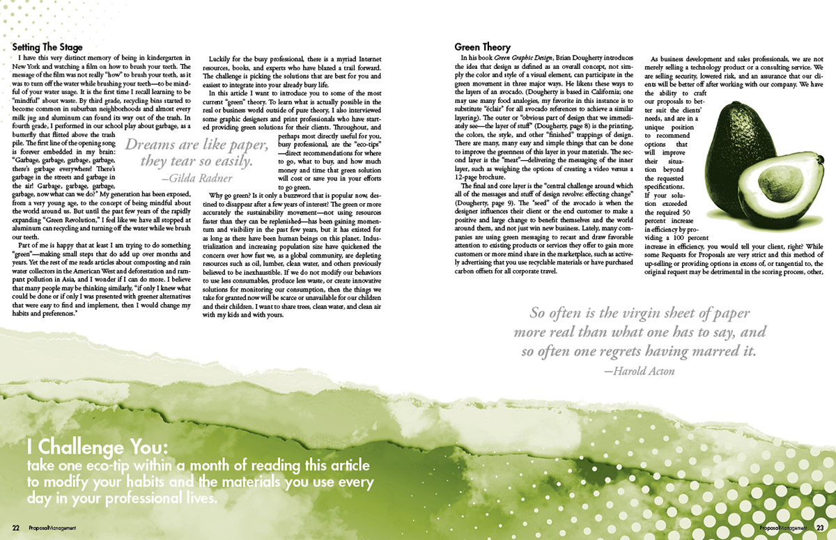 Spreads from an article for the APMP Journal Spring/Summer 2010. The APMP Journal is a two color magazine, typically black with a highlight spot. As a volunteer I was the head of layout design for The Journal from 2007 to 2012.