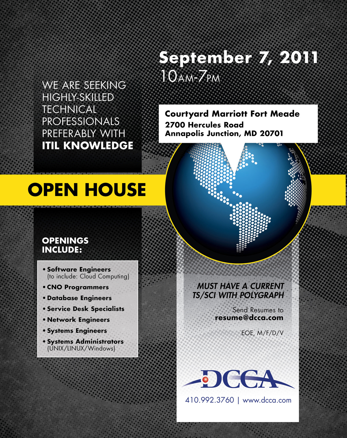 Open house job advertisement poster created for DCCA. The poster was hung in a local Cafe where many technology professionals visited.